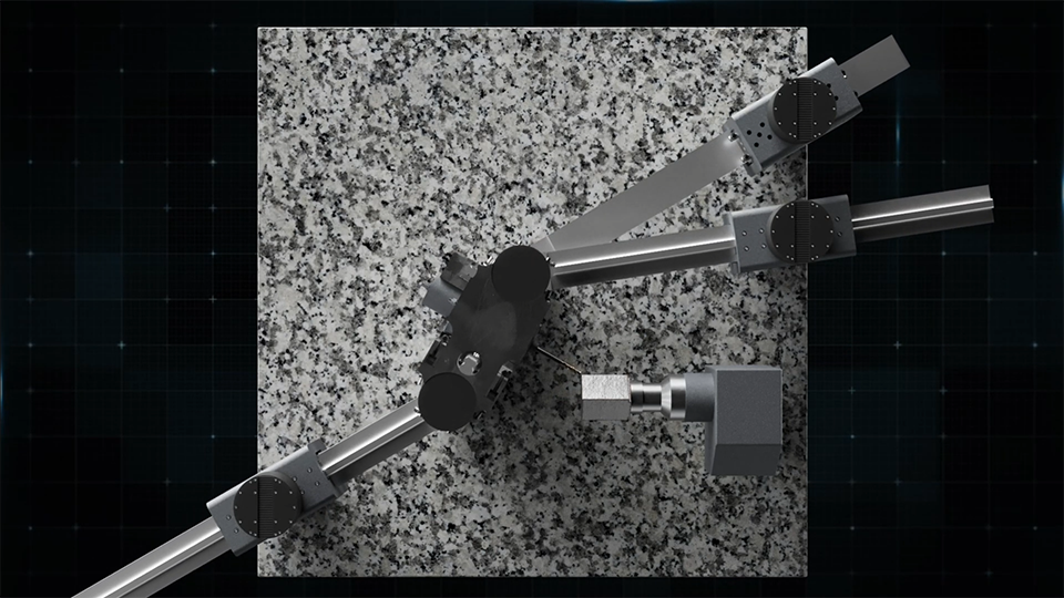 The 3-legged parallel platform moves between two granite surface plates supported by the steel frame, ensuring excellent stiffness in the Y-direction. For clarity, Figure 4 shows only one granite surface plate and omits the steel frame (see Figure 5).